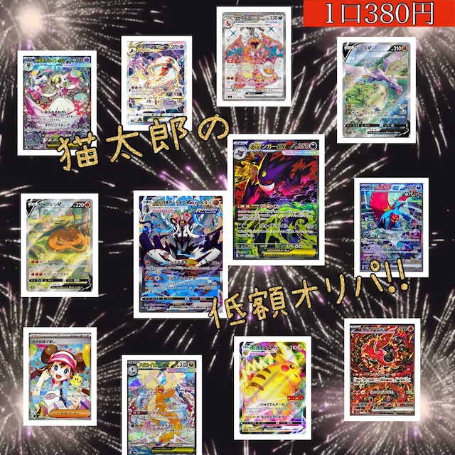 追記:完売しました^^ ★猫太郎のお店 低額オリパ★ ※レギュレーションA.B.C.D.E.F.XY.BWのカードも含まれております。 気にされる方はご購入をお控え下さい。 当店にて予め決めてあるセット数目をご購入された方 計50名様に(50セット) おまけをお付け致します(*⁰▿⁰*) おまけの内容は秘密です(〃ω〃) ※上記に該当の方は 商品に付属してお届け致します。 ☆ポケモンカード 380円(税込)オリパ 15口1セット 380円×15口=5,700円 ☆1口2枚入り ☆全1500口 ☆計100セット ☆条件つきおまけ有 ☆購入制限 おひとり様2セット(再購入不可) ※多くのお客様に楽しんで頂けるよう お一人様2セットまでとなります。 ※2セットを超えて複数回ご購入いただいた場合は 大変恐縮ではございますが超過分に対し キャンセル対応致します。 予めご了承ください。 大当たり•中当たり 画像1枚目をご参照下さい。 他にも隠し当たりご用意しております...(〃ω〃) 小当たり 写真2枚目に一例を乗せております。 他にも多数ご用意しています。 その他 RR or RRR or ACE or A or K or S or AR or CHR or マスターボール柄 or プロモカード or 絶版R or モンスターボール柄 or 優良ノーマル等 丁寧かつ迅速な対応を心掛けています(`・ω・´) *注意 ・カードの状態に関しては別途記載がない場合、 一般的なカード販売店における 状態Aランクのカードを採用しておりますが、 完美品ではございません。 神経質な方のご購入はお勧め致しません。 また、現行レギュレーションのカードと それ以前のカードでは同じ状態Aランクでも 判断基準が異なります。 中古であることをご了承の上、 購入お願い致します。 ・シャッフルの上購入口数分選択するため カードに偏りがある場合がございます。 必ずお目当てのカードを引けるというわけでは ございませんので、ご理解・ご了承の上 購入お願い致します。 ・カードの内容での評価はご遠慮下さい。 ・送料は一律250円 追跡サービスあり ・発送後の事故は保証できませんので、 ご了承ください。 ・コンビニ払い・銀行振込は 対応しておりません。ご了承下さい。 (後払い決済を除く) • 後払い決済については下記をご参照下さい。 https://help.thebase.in/hc/ja/sections/201941041- ・入金確認後1日〜3日以内に発送致します。
